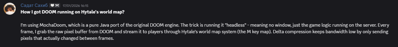 Le développeur a ainsi expliqué sa méthode, que je vous résume ici : il a fait tourner une version Java de Doom (dans le même langage que le serveur Hytale donc) dans une version sans fenêtre, et a réussi à faire tourner l'intégralité de la logique du jeu directement sur le serveur Hytale. Il a ensuite intercepté les pixels pour les afficher sur la carte du jeu faisant ainsi guise d'écran. La méthode concernant Minecraft n'a pas été détaillée, mais il y a fort à parier qu'elle soit identique, Minecraft disposant d'une version Java. Le développeur indique cependant avoir du modifier le système d'affichage du jeu pour qu'il dépende uniquement du processeur, ceci car un serveur Hytale effectue lui aussi ses calculs sur le processeur.